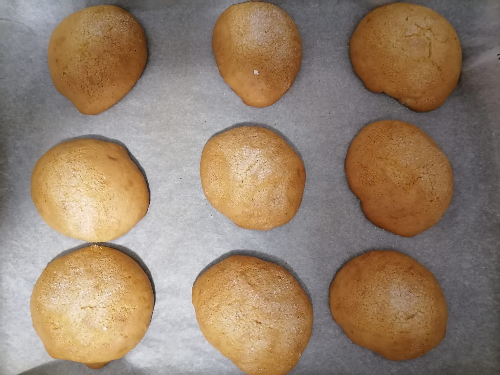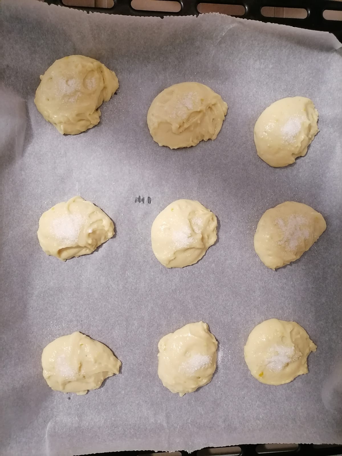 En un bol grande ponemos,primero los huevos, la raspadura, el bicarbonato o levadura y el azúcar. Batimos muy bien y a continuación Le añadimos el aceite, la leche y el zumo. Mezclamos todo y una vez bien batido, vamos añadiendo la harina poco a poco. Dejamos 1/2 hora en reposo y tapada la masa. Calentamos el horno a 180º En la bandeja de horno ponemos papel, y pasada la 1/2 hora, con ayuda de 2 cucharas, vamos poniendo pequeños trozos de masa separadas. (aproximadamente 9 por bandeja) Le ponemos un poco de azúcar por encima y al horno. Tardan como 15-20m. O simplemente cuando se vean doradas